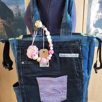 Jeanstas, gemaakt van oude jeans. Zowel aan de buitenkant als binnenkant veel zakjes en een stevige rits. Ringen aan de zijkant om eventueel een schouderriem...